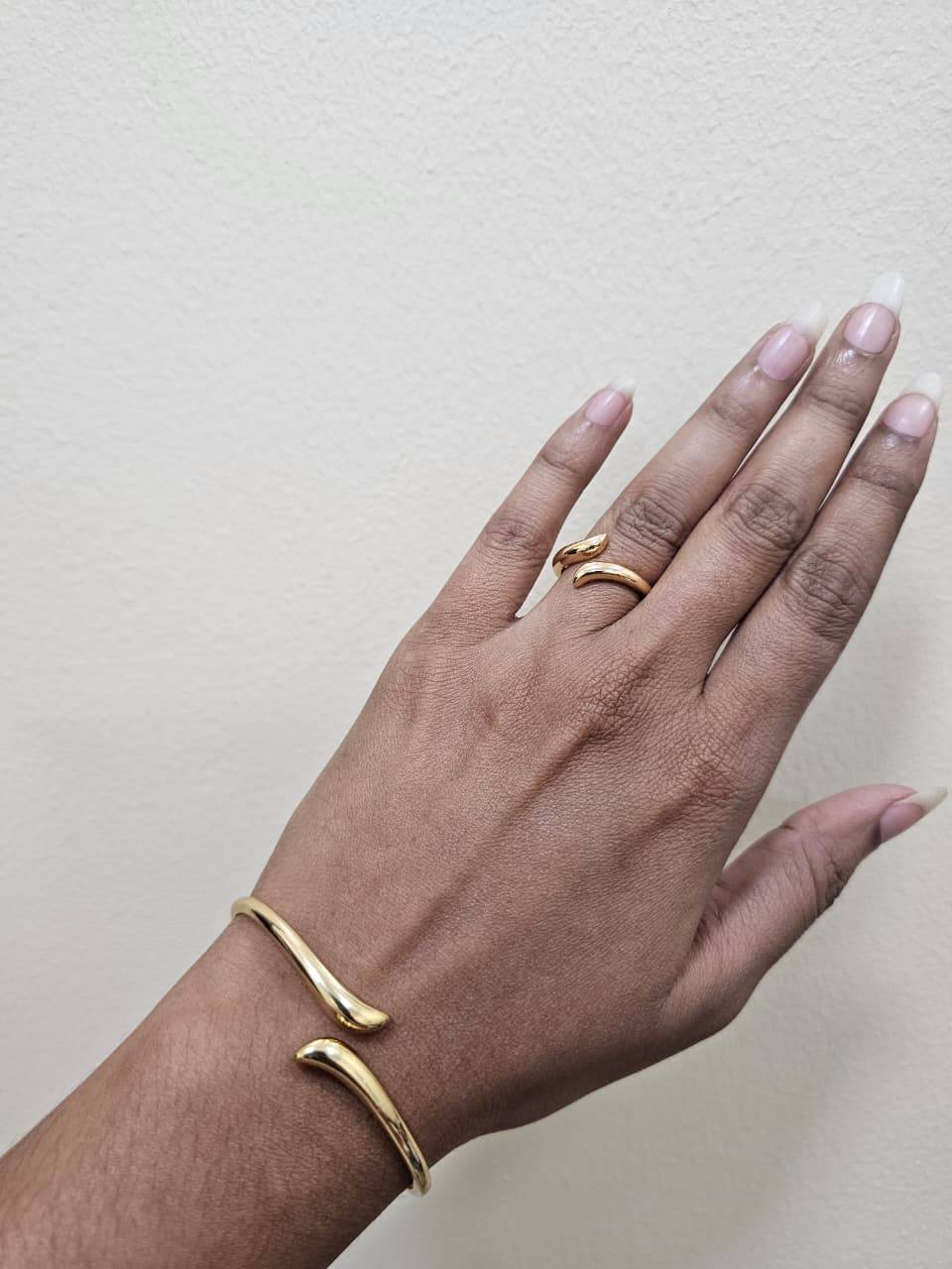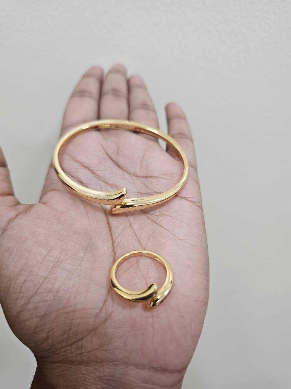 - Design: The bangle features a unique pattern inspired by nature, elegantly intertwining curves that create a sense of movement and sophistication. The accompanying ring complements the bangle beautifully, making it a perfect match for any occasion.